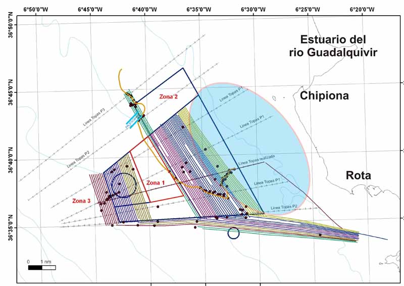 Por ahora nuestra referencia más inmediata son los perfiles sísmicos (los podemos asemejar a cada una de las tajadas que se hacen cuando se corta una tarta; así podemos ver de que está compuesto su interior) que tenemos en nuestra base de datos. La conexión en tiempo real que tenemos con el Centro Oceanográfico de Málaga, donde se encuentra el Dr. Juan Tomás Vázquez Garrido, es muy operativa y funcional, pues nos permite ir adecuando la actividad de cada día en función de los resultados que vamos obteniendo y su contraste con los datos que tenemos en las bases digitales. En uno de los perfiles que nos sirve de modelo, podemos observar el gas metano subsuperficial intercalado en los depósitos del río Guadalquivir, en las cercanías del infralitoral, donde vemos los afloramientos rocosos de la roca ostionera, tan característica de las costas gaditanas. En consecuencia, trabajamos en la zona más próxima a la costa, la que hemos señalado en color azul en el gráfico adjunto, entre las localidades de Chipiona y Rota. Ya hemos comentado alguno de los días anteriores, que la importancia del estudio de los escapes de metano es muy grande y tiene aplicaciones que pueden alcanzar a la medicina, al permitir estudiar ecosistemas extremófilos de los que se podrían extraer organismos vivos que proporcionen componentes orgánicos que permitan tratar algunas enfermedades para las que aún no se ha descubierto ningún tratamiento. Esta vía especulativa, ofrece grandes posibilidades y son muchos los países desarrollados que miran hacia el fondo del océano en busca de recursos biogenéticos que puedan tener utilidades en biomedicina. Otro de los retos que hay que contemplar, además del propio conocimiento científico de los ecosistemas marinos, que encierran cerca del 75% de las especies vivas que pueblan el Planeta, es el de las utilidades que podría ofrecer el empleo de bacterias consumidoras de metano, o de cualquier otro gas invernadero, para la protección ambiental o la lucha contra la contaminación marina o atmosférica. De aquí que, los ecosistemas extremófilos (especies que viven en condiciones extremas, ya sea de temperatura, profundidad, ausencia de oxígeno,...etc) se hayan convertido en un objetivo prioritario en todos los programas de investigación científica del mundo desarrollado.