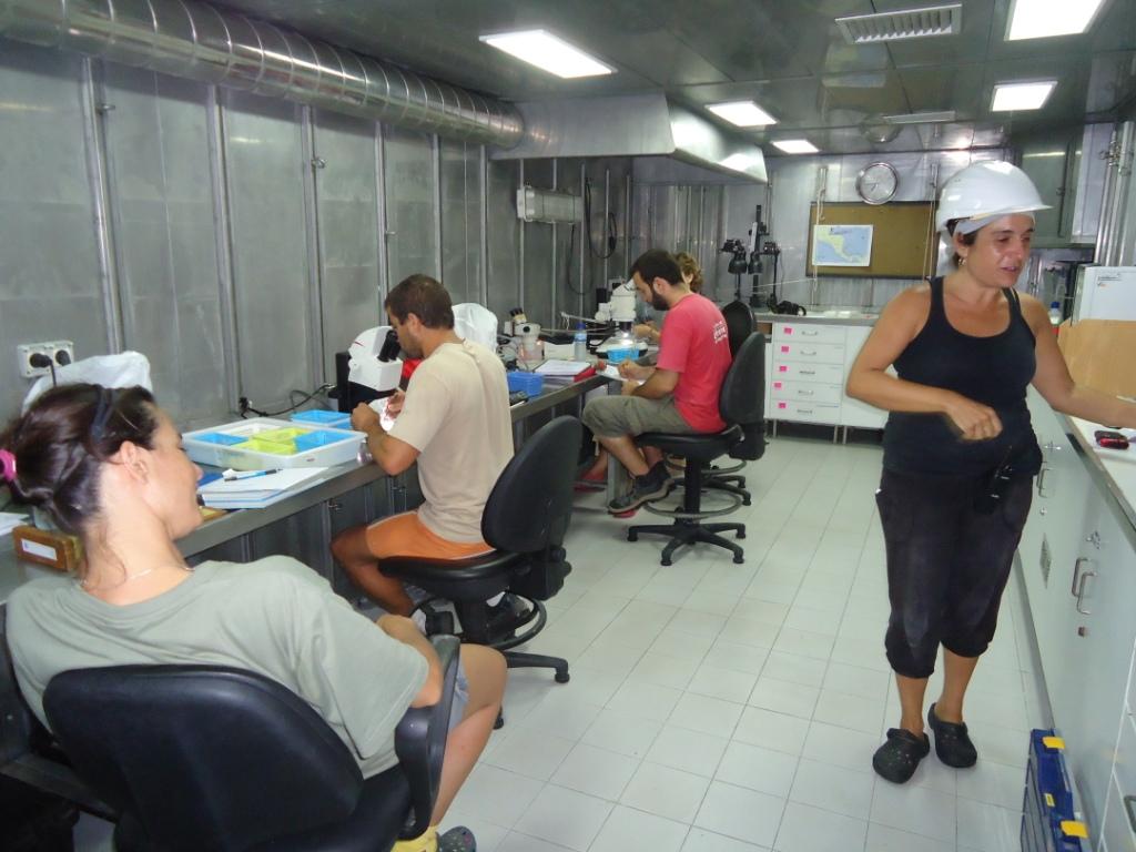 Hoy es un día de mucho trabajo. Ayer hicimos 4 patines epibentónicos, pero para poder tener todas las muestras que se han planificado, hoy toca identificar y clasificar hasta 6 patines. El trabajo debe hacerse bien y de forma eficiente, o podemos correr el riesgo de acabar muy tarde. Mis compañeros trabajan duro, y sobre las 10 de la noche ya está todo el trabajo acabado.