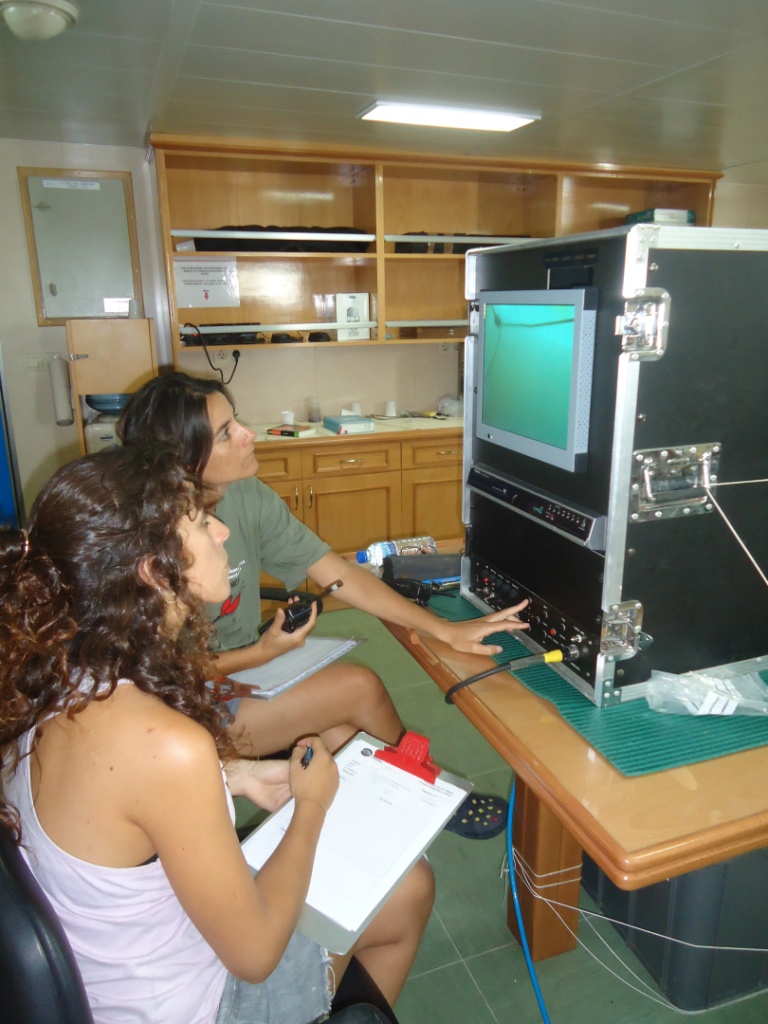 Dos de los participantes en la campaña tomando datos de las imágenes que se obtienen a tiempo real con el trineo fotográfico. De esta manera se puede saber que tipo de fondo se está estudiando antes de descargar las fotos que va sacando la cámara fotográf