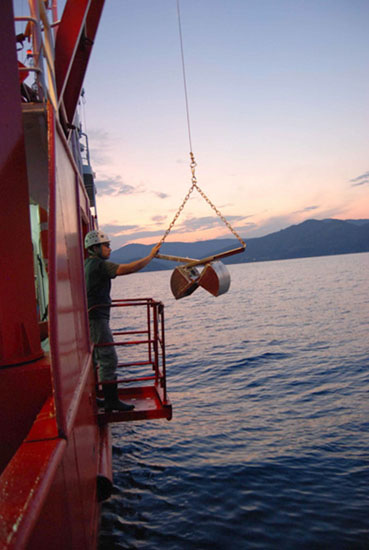 Similar to the calm after the storm, we start a frantic work period on deck after almost no operational activity in order to take maximum advantage of the weather conditions. At night we start to take samples in the canyon thanks to a quiet sea. We use the CTD probe for the first time, which is equipped with a system of hydrographic bottles which permits accurate water collection at different depths. With this we know the conditions of temperature, salinity, oxygen content, concentration of inorganic nutrients and organic matter all along the water column. Once the water is collected in painstakingly washed bottles, it is filtered in some filters, which after freezing, they will be analyzed at the Institute. Activities like this involve the people on deck as well as in the lab, since the water should be processed and filtered immediately. Once the water samples are finished, we end the night by fishing zooplankton.