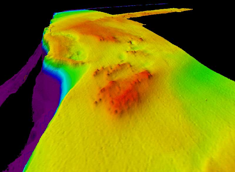 Our campaign started with the bathymetric and geomorphologic characterisation of the southern area of the canyon we had no information on. As can be seen in the picture, there are a series of areas with small localised projections on a plateau measuring some 20 metres in height.