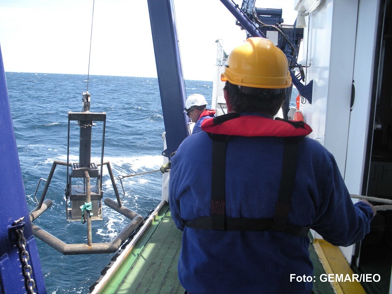 Momento en el que la draga box corer alcanza la superficie y es recuperada a bordo. Estos muestreos son fundamentales para poder identificar la naturaleza del fondo y las especies que viven en el interior del sedimento, tratando de buscar en ellos alguna