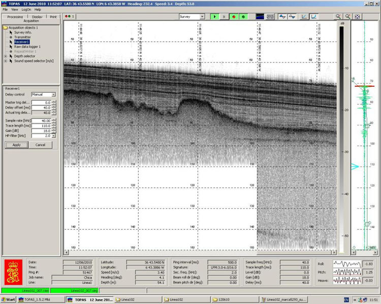 Ya podemos comprobar que lo que ha publicado es más que cierto. Viento del oeste fuerza 3 arreciando a 4 por la tarde, marejadilla con áreas de marejada por la tarde. Nuestra estación nos dice, además, que el viento es de dirección 199º con velocidad de 3.9 m/s y ráfagas de 4.7 m/s. La presión atmosférica es de 22.9 y la humedad relativa de 75.7%. La temperatura del aire 18.9º C y la radiación solar es de 270.7 W/m2. Decidimos que, ante los errores de multihaz no levantaremos el perfil de velocidad, y trabajaremos con TOPAS siguiendo la red de perfiles que se crucen con los anteriores y tengamos puntos de contraste de espesores.