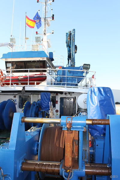 La maquinilla de popa, los tornos y las grúas aguardan el momento de empezar a actuar. Cuando finalicemos esta fase de prospección, se iniciará la fase de muestreo faunístico y sedimentológico ©IEO