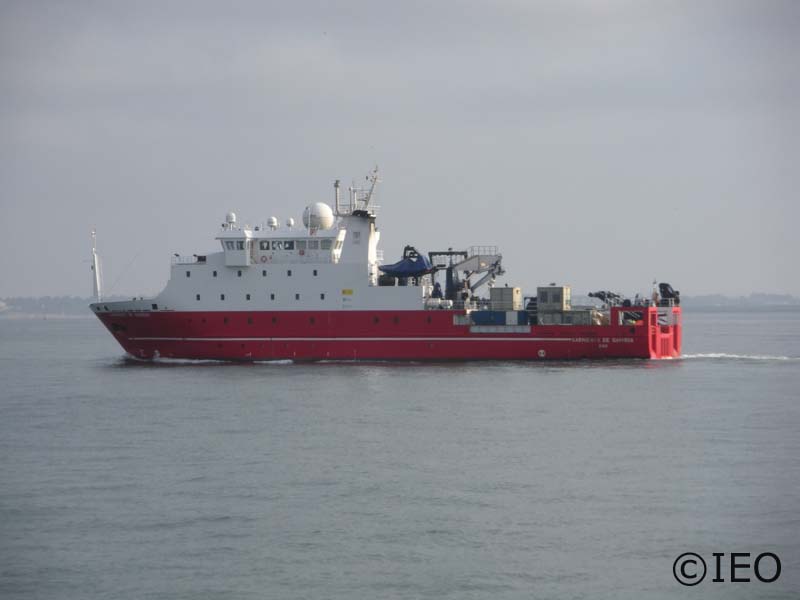 El B/O Sarmiento de Gamboa navegando junto a nosotros por la canal que atraviesa la bahía y que marca el acceso al puerto de la Zona Franca ©IEO