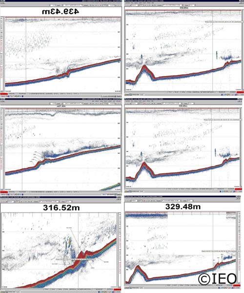 La expedición científica confía plenamente en los datos indirectos que hemos revisado en el COMA y en los que estamos recogiendo ahora cada vez que estamos en tránsito. Pero observad con detenimiento cada uno de los perfiles. Veréis, en primer lugar, que hay algunos que están girados. Esto nos lo ha hecho el sabio IP para que resulte más comprensible el dibujo y así ponerlos todos orientados en la dirección en la que se dispone el talud continental, lugar en el que estamos trabajando. A la derecha de cada pantallazo está el Este y a la izquierda el Oeste. Esa línea inclinada, en fuerte pendiente hacia la izquierda (Oeste), es el fondo del mar, y ese cono pegado al suelo marino, es el volcán de fango Gazúl. ¿Lo veis? Pues si es así, entonces tratar de comparar el tamaño de Gazúl con el de Albolote..... ¡Un auténtico churro!.... ¿no? pues ese es el reto. Afortunadamente, tal y como os he dicho en alguna otra ocasión, el tamaño no es lo importante si no el fenómeno: la expulsión de fluidos cargados en metano y el hábitat que genere, por muy chiquitito que quiera ser. Ahí estamos nosotros para tratar de descubrirlo.