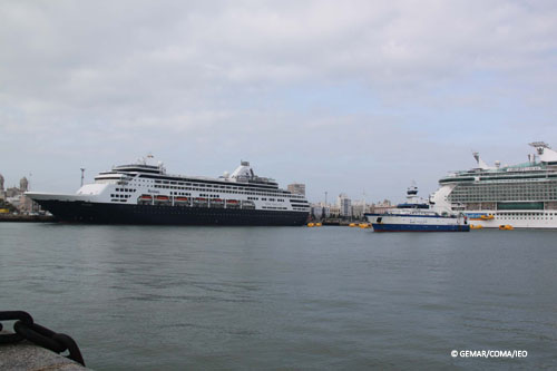 No pudimos entrar en puerto hasta cerca de las 11:30 pues teníamos cola de cruceros esperando a atracar. Dos inmensos cruceros de la Royal Caribean, compañía en la que viaja el IP durante sus vacaciones, y otro crucero de la Holland Cruises Company. Tres cruceros en total en el puerto de Cádiz. Increíble. El Vizconde de Eza hizo su magistral entrada en puerto una vez que los cruceros habían quedado bien acomodados en sus muelles y los turistas empezaban a circular en dirección a la ciudad trimilenaria.