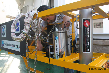 A continuación nos dirigimos al volcán de fango Gazul, uno de los más atractivos faunísticamente de todos cuantos hemos estudiado en la zona del caladero del Laberinto. A las 13:46 nos encontramos en la vertical del punto. Las facilidades que ofrece el sistema de posicionamiento dinámico del buque nos permite permanecer en el sitio el tiempo que sea necesario sin producir ningún desplazamiento sobre el fondo. Así que de esa manera podemos filmar la actividad en un punto concreto. Realizamos otro transepto con el VOR, recuperando algunas tomas de video muy singulares, aunque turbias. Cambiamos la longitud del pulso del localizador acústico (pinguer) para que pudiéramos observar la posición del VOR sobre el fondo con mayor precisión. Este dispositivo emite un pulso sonoro que interfiere en la sonda batimétrica e introduce una señal en el registro que permite localizar el VOR en la pantalla del ecosonda.