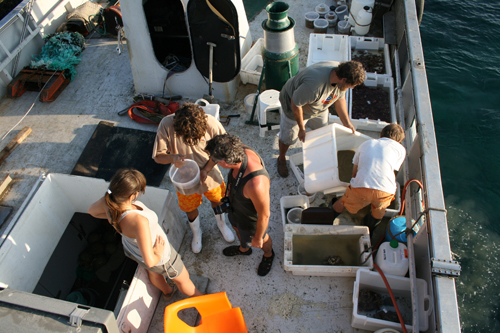 Después de la llegada del lance, hay una actividad frenética en cubierta para tamizar el sedimento y separar la fauna y flora. La manguera roja es la del famoso “caballo”. Foto: Marta Pola