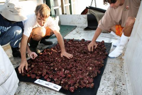 Para empezar con algo fácil, lanzamos la draga en un fondo de rodolitos relativamente llano, correspondiente a uno de los transectos de vídeo realizados por OCEANA en 2007 al SW de la isla. Los que siguen este diario ya saben lo que son los rodolitos (palabra derivada del griego, que quiere decir “piedra roja”, aludiendo al color rojo del alga que forma estas concreciones).