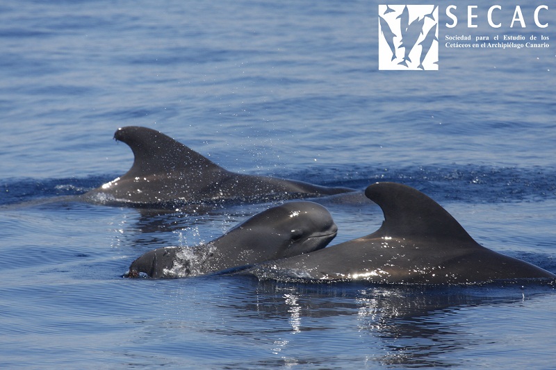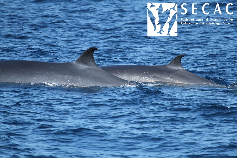 Así, durante los dos primeros días de campaña se registró la presencia de varios grupos y especies de cetáceos. Los delfines moteados del Atlántico (Stenella frontalis) y los delfines listados (Stenella coeruleoalba) han sido frecuentes durante los últimos meses debido a la abundancia de cardúmenes de presas, a cuyo banquete acuden también los delfines comunes (Delphinus delphis) que, sin embargo, no aparecieron estos dos días. Sin embargo otra especie frecuente en la depredación de estas pequeñas presas, el rorcual tropical (Balaenoptera edeni), no sólo fue avistado sino que apareció en compañía de crías. Los delfines mulares (Tursiops truncatus), calderones tropicales (Globicephala macrorhynchus) y zifio de Cuvier fueron las otras especies registradas por la SECAC. De hecho, y gracias al análisis de Foto-identificación, se comprobó que el grupo de delfines mulares, de más de 70 animales, coincidía con los avistados dos meses atrás frente al Sur de Lanzarote, integrado por individuos de todas las clases de edad incluyendo a varios neonatos.