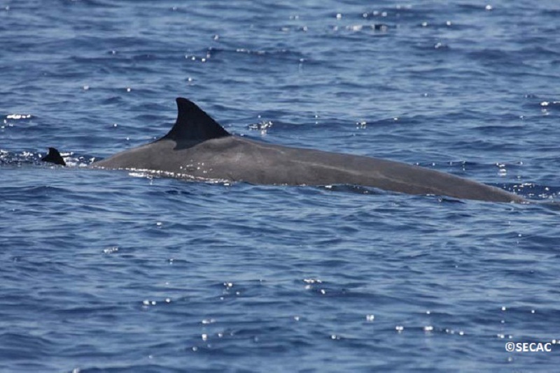 Se avistan zifios de Blainville (Mesoplodon densirostris) durante la parada de la primera escucha acústica. Aparecen un macho y dos hembras a escasos metros del barco, rodeándolo pausada y tranquilamente, permitiendo la obtención de unas excelentes fotos para su estudio morfológico e identificación. Tras casi 50 minutos en su compañía deciden finalmente sumergirse, momento en el cual abandonamos el avistamiento y continuamos con el esfuerzo de campaña.