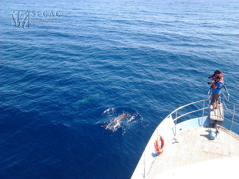Todo está listo y acondicionado para zarpar. Abandonamos el muelle de Puerto Calero a las 9:30 h. Aparte del equipo habitual, hoy nos acompañan Jorge Cáceres, Clara Suárez, Violeta Sánchez, Francisco González y David Luna. Igual que ayer, el día ha estado muy bueno y las condiciones para avistar cetáceos han sido inmejorables. Poco viento, escaso mar de fondo, cielo despejado la detectabilidad ha sido excelente durante todo el día, de nuevo algo poco habitual en esta zona.