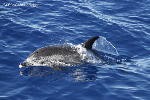 Después, durante todo el día hemos observado saltos y cuerpos fuera del agua que no se han podido identificar más allá de la familia (Delphinidae) y dos grupos de delfines moteados. Uno estaba compuesto por 12 ó 15 juveniles que han venido saltando a la estela de la proa y el otro, mucho más grande (entre 70 y 80 individuos) con adultos y crías. Estos últimos nos han seguido durante aproximadamente 2 horas, con un repertorio muy variado de silbidos y clicks en el hidrófono, y tan alto que hemos tenido que bajar el volumen de los altavoces.