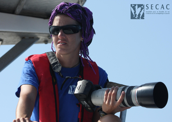 Donde sí se anotaron todos los grupos de edad, neonatos inclusive, fue durante el contacto con varios grupos de delfines moteados (Stenella frontalis), que, como siempre, se sintieron atraídos hacia el barco, sobre todo a la ola que desplaza la proa y al cable del hidrófono, donde estuvieron emitiendo silbidos y clicks durante gran parte del avistamiento. A destacar en esta primera semana también fueron dos avistamientos de zifios de Cuvier (Ziphius cavirostris) y uno de cachalote enano (Kogia sima). En el caso de los zifios, hubo un avistamiento de 4 individuos, mínimo dos machos maduros, que llamó la atención de los investigadores por lo inusual de ver a los zifios inmóviles en superficie ¿descansando quizá? Después de inmersiones relativamente cortas (no más de 15 minutos). Se realizaron diez esperas y después de todas ellas los individuos fueron reavistados y fotografiados. El cachalote enano sin embargo, apenas si pudo ser fotoidentificado desde lejos ya que nada más detectar la presencia de la embarcación se hundió y no volvió a ser visto.