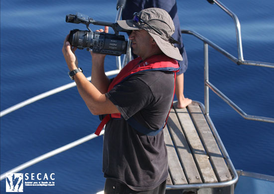 Empezamos así las salidas de esta nueva etapa el día 9 de septiembre, con la visita de la televisión alemana; Willi Meyer y su equipo de Canal ARTE se presentaron a primera hora en el Oso Ondo con cámaras de fotos y vídeo, trípodes, micrófonos y demás artilugios que se mezclaron rápidamente con todo el material de investigación. Su objetivo: grabar el trabajo de la SECAC, incluyendo las campañas en el mar como esta de INDEMARES. Además de la televisión también nos acompañaba Sara Schulz de la revista Lanzarote 37°, con idéntica misión. Como intérprete y colega vino Klaus Guttemberger y por si algún buen plano pretendía escapar a nuestros objetivos audiovisuales, también embarcó Rafael Herrero, de AQUAWORKS, colaborador habitual de la SECAC y artífice de los documentales e imágenes submarinas que la SECAC utiliza en sus trabajos, con su equipo de filmación submarina. Con tanta expectativa todos cruzábamos los dedos para que fuera un buen día… además también comenzábamos a trabajar con nuestro nuevo patrón, Santiago Quintana, Chago para todos desde el primer día, gran conocedor del mar y patrón en barcos de investigación desde hace más de 20 años.