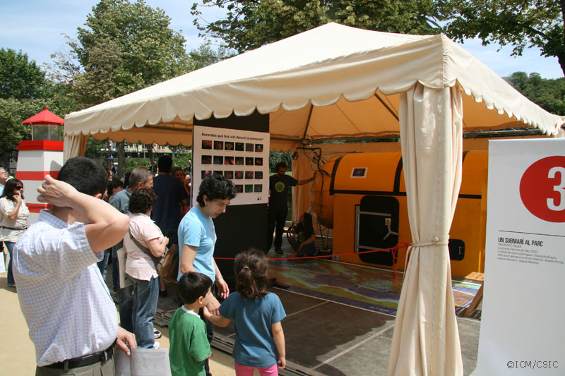 La otra actividad que el ICM desarrollo fue el submarino del proyecto LIFE+ INDEMARES, el cual recrea una inmersión real en el Cañón de Creus y por donde llegaron a pasar casi 800 personas. Nuestros mares son todavía desconocidos y el poder mostrar a la gente lo que existe a 100 metros de profundidad en sus propias costas, explicándoles la importancia que tiene, es una herramienta de divulgación imprescindible en el proyecto INDEMARES. Se retrasmitió en la televisión y en la radio siendo el acontecimiento todo un éxito