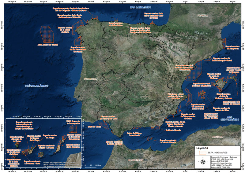 De estas 39 ZEPA, ocho se localizan en el ámbito de la demarcación marina Noratlántica, tres en la demarcación marina Sudatlántica, tres en la demarcación marina de Estrecho y Alborán, 14 en la demarcación marina Levantino-Balear, y 11 en la demarcación Canaria, lo que supone alrededor de 4,9 millones de hectáreas marinas incluidas en la Red Natura 2000.