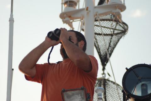 Para ello, un observador realizó estimas de las densidades (aves/km2) y abundancias relativas (aves/km) de aves marinas, siguiendo la metodología de censo estandarizada propuesta por Tasker et al. (1985) y adaptada por SEO/BirdLife (2007) a la zona de estudio y a los transectos lineales establecidos en el protocolo de trabajo de la campaña. Dicha metodología consiste en contabilizar las aves observadas en una franja imaginaria (generalmente 300 m) establecida a uno o dos lados del barco (en función de las condiciones de observación) al frente, a medida que éste avanza a una velocidad y dirección constante. Para las aves en vuelo se aplica una corrección basada en conteos instantáneos o snap-shots. Se realizaron censos coincidiendo con los reconocimientos batimétricos, los perfiles sísmicos y los perfiles de la velocidad del sonido en el agua, así como aprovechando las navegaciones realizadas entre el área de trabajo y los puertos de Santa Cruz de (Tenerife) y el Puerto de Los Mármoles (Lanzarote). No se realizaron observaciones sistemáticas de aves marinas cuando se trabajó con las dragas. Durante la realización de los censos por transectos también se registraron los datos de todos los cetáceos observados.