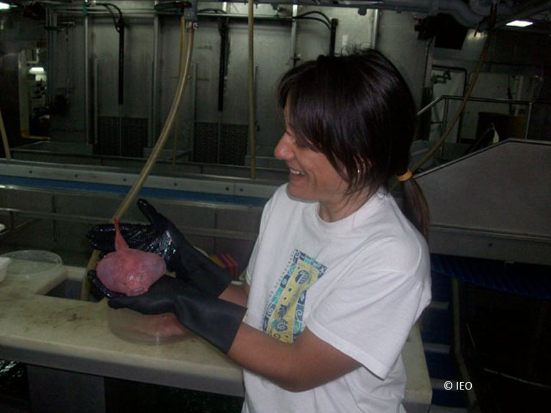 En el primer muestreo del día 28 batimos el récord de profundidad del “Miguel Oliver” y, probablemente, de las campañas españolas del IEO, al realizar un arrastre de GOC en una playa sedimentaria a 1.700 m de profundidad. La muestra obtenida es de un interés enorme. Los expertos en taxonomía encuentran más de 10 especies de peces, crustáceos y moluscos que serán nuevas citas para aguas españolas; alguna especie no se había vuelto a encontrar desde su descripción hace más de un siglo. La composición faunística es muy diferente a la de las zonas menos profundas del banco, con una clara dominancia de las especies que se alimentan de la materia orgánica depositada en el sedimento, como las holoturias o pepinos de mar. Las de estas profundidades son de un tamaño relativamente grande y casi translúcido, debido a que buena parte de su cuerpo está formada por agua, lo que permite ver al trasluz su tubo digestivo repleto del sedimento que tragan para alimentarse.