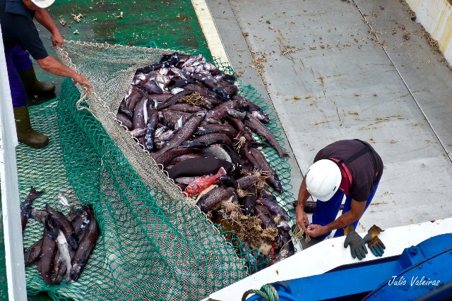 Después de almorzar, se larga el GOC a 1.536 metros. Va a ser muy difícil mantener el rumbo preciso, pero el peso de las puertas ayudará para que la corriente no desvíe el arte. Las nuevas puertas que recogimos en Vigo el día 1 pesan casi tonelada y media cada una, lo que hace caer a pico el GOC. Se largan casi 3 km de cable. Al minuto de hacer firme, la red encalla, y la maquinilla empieza a soltar cable libremente para intentar escapar de la roca. Viramos con la preocupación de ver si se consigue recuperar la red; habrá que esperar pacientemente casi una hora para izar a bordo todo el cable largado. El puente está muy concurrido, pero apenas se habla. Suspiros de alivio al ver que llegan las puertas,  detrás vienen las malletas y el resto del arte milagrosamente entero, con apenas unas esponjas en forma de abanico (Phakellia), un pez de gran boca (Chauliodus) y algún trozo de coral bambú y restos de coral muerto.
