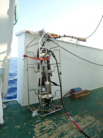 CTD (de las siglas en inglés: Conductivity, Temperature and Depth), equipo de estudio hidrográfico, con el que se mide salinidad, presión, fluorescencia, oxígeno disuelto y temperatura de las masas de agua. Campaña Agosto 2011 Canal de Menorca © IEO