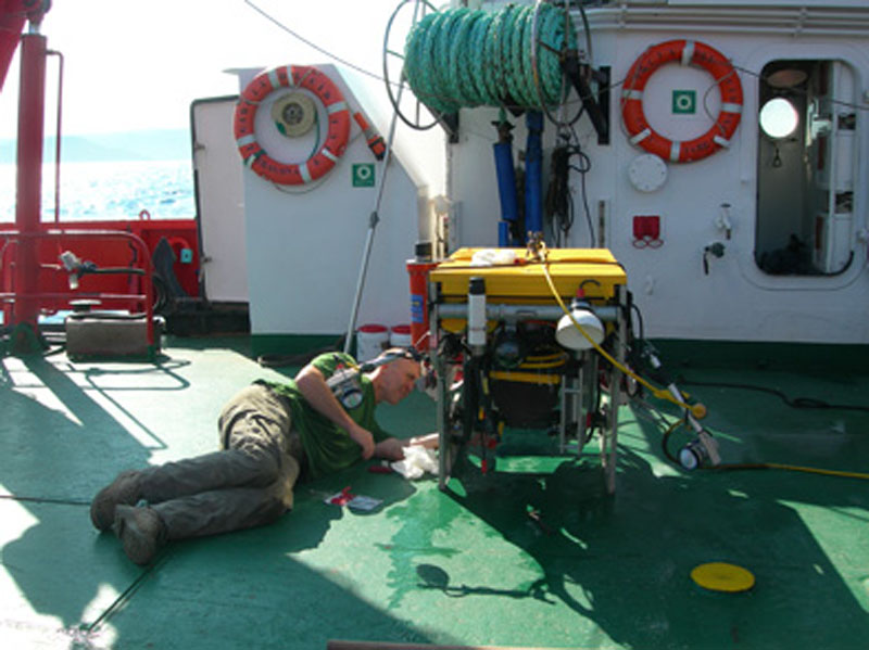 Algunos de nuestros compañeros se fueron a dormir porque las actividades no se interrumpen a bordo y a las 7 de la mañana hay que preparar el ROV para su primera inmersión del día. Cansados y un poco hastiados de tanto barro decidimos concluir el trabajo a las 4 de la mañana y darnos un respiro para dentro de unas horas.