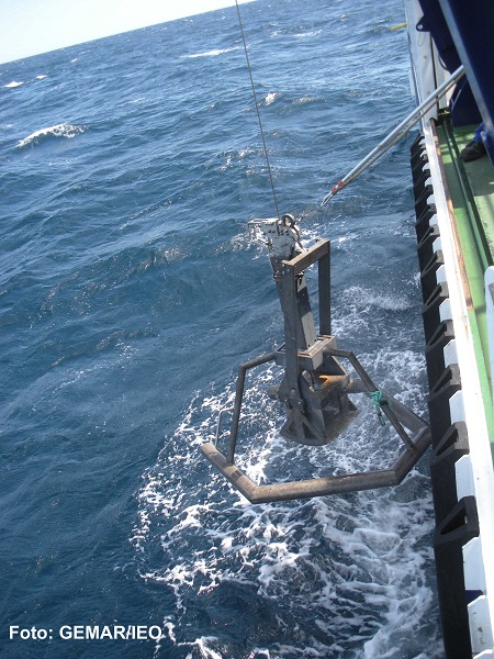 Las muestras de box corer nos sorprenden por la cantidad de siboglínidos que aparecen, lo cual indica que el punto de muestreo es un foco de emisión activo. Nos vuelve a sorprender la distribución del sedimento, con depósitos más finos al techo y más gruesos al muro. Nos encontramos en una zona donde se hace notar una de las venas más meridionales de la masa de agua mediterránea. Nos desplazamos hacia una de las depresiones que circundan Almazán (uno de los conos más prominentes de los que existen en la zona de expulsión profunda, en la que no faena la flota pesquera y, en consecuencia, los ecosistemas están mejor conservados) y arriamos de nuevo el VOR APHIA 2012 para realizar un nuevo reconocimiento. El control del robot es más difícil a estas profundidades (900 metros) por lo que procuramos que los desplazamientos del buque sean aún más lentos. Tomamos 800 fotografías que resultan algo más insulsas que las anteriores. Por lo que parece nos encontramos en una zona en la que a penas hay vida. Dominan los corales bambú, aunque no en número elevado. Creemos que son ecosistemas muy frágiles que son capaces de sobrevivir en unos fondos dominados por los fangos, en cuyo interior hay una gran actividad bacteriana. Los registros térmicos y de potencial redox nos vuelven a confirmar que la actividad bacteriana, que provoca reacciones exotérmicas, es el factor que controla el desarrollo de los ecosistemas.