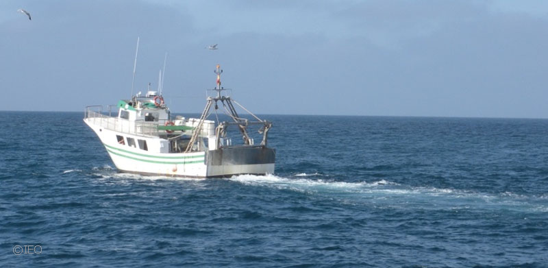 Arrastrero en plena faena, con el arte calado atravesando una de las líneas que hemos realizado en el día de hoy. Este tipo de cruces es relativamente frecuente, amen de otros muchos encuentros con otro tipo de artes pesqueros ©IEO