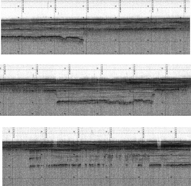 Realizamos, para empezar, una de las líneas más espectaculares de las que hemos visto hasta el momento. Atravesamos los afloramientos de las rocas pliocenas que forman el infralitoral distal frente a las costas de Chipiona y Rota. Podréis ver un ejemplo de lo que digo en una de las figuras que acompañan este texto. Observad el fragmento de mosaico de multihaz y al pie un fragmento del perfil de TOPAS en el que se ve un picacho que, sencillamente, representa una parte del relieve que tiene esta roca tan característica del litoral gaditano. Sobre este perfil hemos podido contemplar algunos ejemplos muy variados de la forma que tiene de presentarse el acumulo de gas cerca de la superficie. Tenéis en otra de las figuras, un conjunto formado por tres perfiles de TOPAS en los que se aprecia el efecto que produce el gas metano en el interior de los sedimentos. Unas veces genera un apantallamiento continuo y otras veces genera las denominadas ventanas, que son espacios limpios de gas en los que se detectan otros componentes más profundos de la serie sísmica. Si veis con detenimiento los tres casos, observaréis que son absolutamente diferentes. Nuestro reto ahora es planificar el muestreo de sedimento con la vista puesta en intentar comprobar los posibles lugares en los que el gas pueda alcanzar la superficie del fondo marino, o bien las zonas en las que el gas se filtra por los sedimentos de la serie superior -la que está más cerca de la superficie del fondo-, y constatar si genera algún tipo de ambiente que determine la aparición de un hábitat 1180.