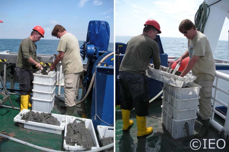 Teníamos mucho que celebrar. Hemos empezado a constatar la existencia de chimeneas carbonatadas en el volcán de fango Gazul. Los científicos han comprobado, en los primeros muestreos, la génesis metanífera del edificio volcánico, pero no se había constatado la presencia de chimeneas carbonatadas autigénicas en este volcán de fango. Así que, ahí esta la noticia: Científicos del IEO descubren chimeneas carbonatas en el volcán de fango Gazúl. Esta es la primera cita que se realiza de estas formaciones rocosas, que el IP denomina en términos coloquiales bio-rocas, que son el producto de la actividad bacteriana en el interior de los sedimentos. Esto abre una nueva vía especulativa sobre el impacto de las emisiones de gas metano del fondo marino. En la fotografía que os presentamos aparece Curro López, todo feliz y contento, tras haber recuperado unas muestras de chimeneas en el interior de una masa de fango grisáceo, característico de las fácies sedimentológicas de los volcanes de fango.