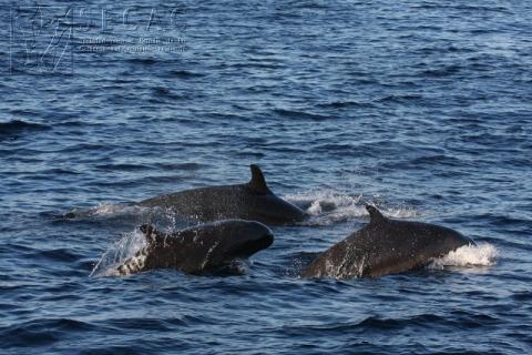 La detección visual del primer cachalote (Physeter macrocephalus) se ha realizado a mediodía pero la embarcación se hallaba en seguimiento acústico desde las 11:30, hora en la que se han empezado a escuchar los clicks a través del hidrófono. Se han fotografiado 15 animales diferentes y aunque se ha intentado conseguir una muestra de alguno de ellos mediante una biopsia, finalmente no ha sido posible. El seguimiento del grupo de cachalotes ha continuado hasta las 16:52 h y en ese intervalo se han avistado otras especies de cetáceos y muchas tortugas. A las 12:03 h se han avistado calderones tropicales (Globicephala macrorhynchus) en varios subgrupos de 7-11 animales y en total, sumándolos todos, se ha estimado que en la área habría unos 55-60 individuos. Se han fotografiado adultos, subadultos, juveniles y crías, aunque ningún neonato. También había varios machos maduros, tan llamativos por su gran tamaño y dimensiones de la aleta dorsal. Los avistamientos siguientes, de delfín común (Delphinus delphis) y delfín moteado (Stenella frontalis) han sido muy rápidos. Se han anotado los datos básicos como tamaño de grupo, clases de edad, actividad, rumbo, reacción y se han fotografiado los animales para tener constancia del encuentro, pero no son especies objetivo de fotoidentificación individual ni genética. El grupo de delfines comunes era de tamaño medio (aproximadamente 20 individuos) y el de delfines moteados muy pequeño, sólo se han contabilizado 5 animales jóvenes que se han acercado al barco.