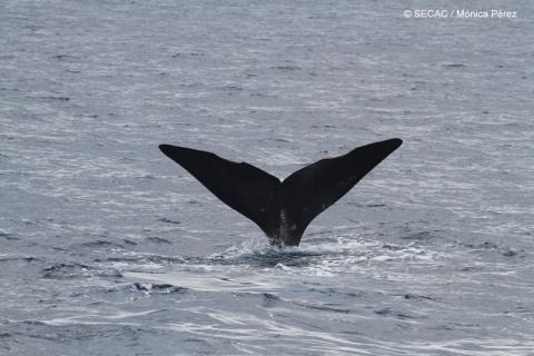 la detectabilidad es baja. Afortunadamente se detecta un cachalote a través del hidrófono a las 12.03 h y el avistamiento tiene lugar 30 minutos después. Se trata de un individuo que se desplaza lentamente hacia el sur y se fotoidentifica su aleta caudal cuando se sumerge para alimentarse. Tras el cachalote nos encontramos con 2 rorcuales tropicales muy evasivos y difíciles de seguir. Sólo se puede fotoidentificar uno de ellos. Además a las 16.00 h comienza a llover y debemos suspender el esfuerzo visual. Ponemos rumbo a puerto porque también tenemos ya mucho viento y más de 2 m de ola
