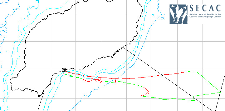 A última hora de la tarde ya de vuelta al puerto, se acercaron al barco varios delfines moteados (Stenella frontalis) de 4 a 6 ejemplares entre adultos y subadultos, permaneciendo durante unos minutos surfeando en la estela de la proa. No se fotografiaron debido a la falta de luz, no obstante el comportamiento acústico realizado junto al barco fue claramente registrado.