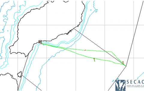 El mar de fondo, también del NE, no ha superado 1 m de altura pero las pequeñas crestas de las olas han hecho que la detectabilidad sea pobre (valor 1) la mayor parte de la travesía. El día ha estado muy despejado (nubosidad <20%) y sin rastro de la calima de las últimas semanas. Aunque las condiciones no han sido del todo malas, los transectos que se han realizado (elegidos aleatoriamente según la metodología del programa Distance Sampling) han resultado quedar totalmente atravesados a la ola y durante todo el día el Oso Ondo se ha mecido de una banda a otra, que aunque suavemente, no deja de ser un movimiento bastante incómodo después de unas cuantas horas. Aun así, la buena temperatura, el sol, el buen humor de los nuevos voluntarios y dos grupos de delfines en la proa, han hecho de la salida un día de trabajo agradable.